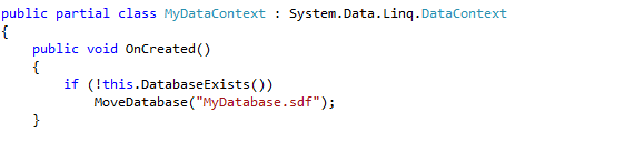 Above, we have created a second, partial class for MyDataContext. OnCreated is called inside every constructor, this gives you a perfect chance to ensure your database has been copied from the Application Folder to Isolated Storage.