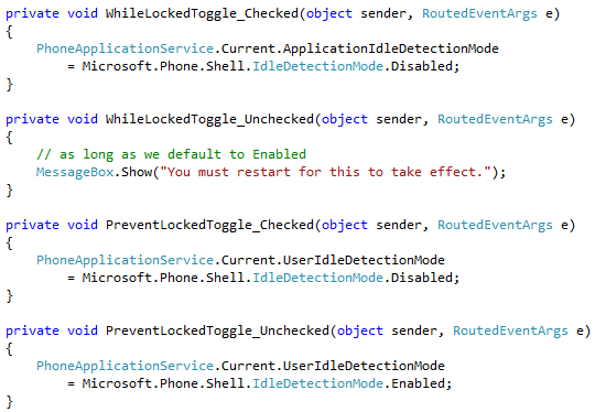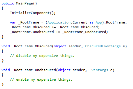 In the code above, see the Obscured handler? If your Windows Phone application runs with Lock Screen is engaged, here you can reduce power and bandwidth consumption with things like: