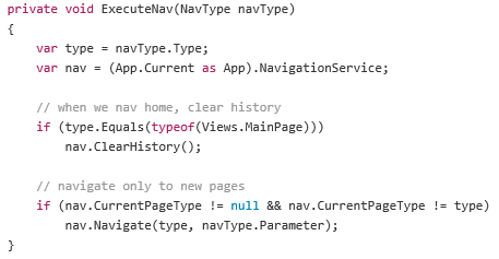 The NavCommand is for everything else, navigating to the page specified in the RadioButton’s CommandParameter property. All frame operations are actually NavigationService methods, so they are already encapsulated and nice.