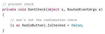 The DontCheck handler is a utility method in the Shell.xaml code-behind; we can use this for any RadioButton to ensure it is never checked. If you think about it, since the hamburger button is only a toggle of the SplitView’s IsPaneOpen property, it doesn’t make sense for it to have a selected state. The same is true with the Back button.Implementation