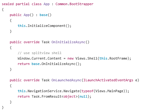 The important takeaway is the OnInitializeAsync implementation. Setting the root visual (that is to say, Windows.Current.Content) to the Shell and passing the new Shell our Frame is all we need to update. The OnLaunchedAsync implementation has not changed at all.